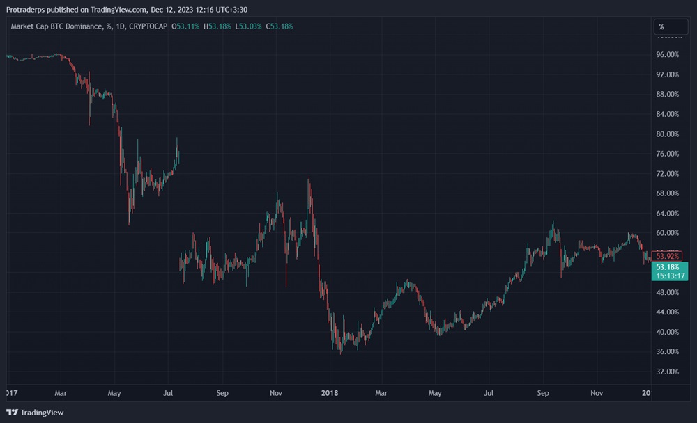 شاید رشد تصاعدی بازار ارزهای دیجیتال از نظر تعداد توکن‌ها را بتوان سال ۲۰۱۷ دانست. سالی که سیلی از عرضه اولیه‌ توکن‌ها (ICO) بازار را شاهد بودیم. جالب است بدانید که هجوم آلت کوین‌ها در این بازه زمانی، دامیننس بیت کوین را از ۹۰% به حدود ۳۷% در ابتدای سال ۲۰۱۸ کاهش داد.