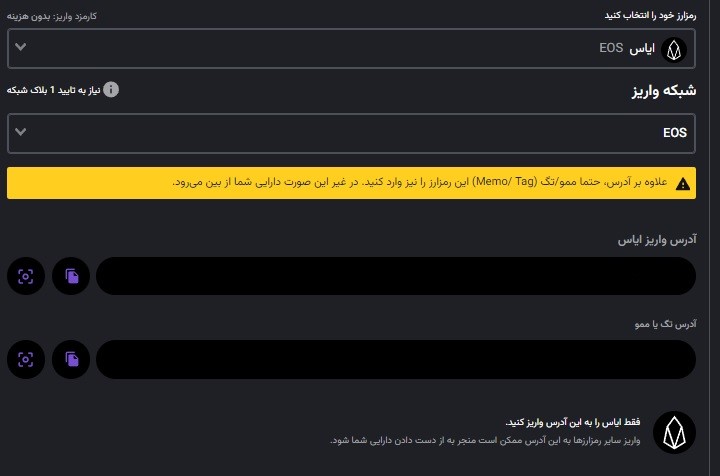 بعضی از شبکه‌های رمزارز، برای اطمینان از درست بودن آدرس، کاربران را به وارد کردن تگ یا ممو برای انتقال ملزم کرده‌اند. یعنی علاوه بر آدرس مقصد، باید مموی آدرس را هم وارد کنید. در حال حاضر شبکه‌های XRP ، XLM ، ATOM ،HBAR ، TON و EOS شبکه‌هایی هستند که ثبت تگ/ممو برای آن‌ها اجباری است. ثبت نکردن تگ یا ممو هنگام واریز در این شبکه‌های رمزارزی می‌تواند موجب از بین رفتن دارایی‌های شما شود. بنابراین هنگام نقل و انتقال در این شبکه‌ها حتما علاوه بر کپی کردن آدرس کیف پول مقصد، مموی آدرس را هم کپی و در کیف پول یا صرافی مبداء وارد کنید. در تصویر زیر از رمزینه، محل درج آدرس کیف پول و آدرس تگ یا مموی مقصد، مشخص است.